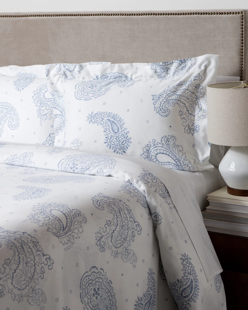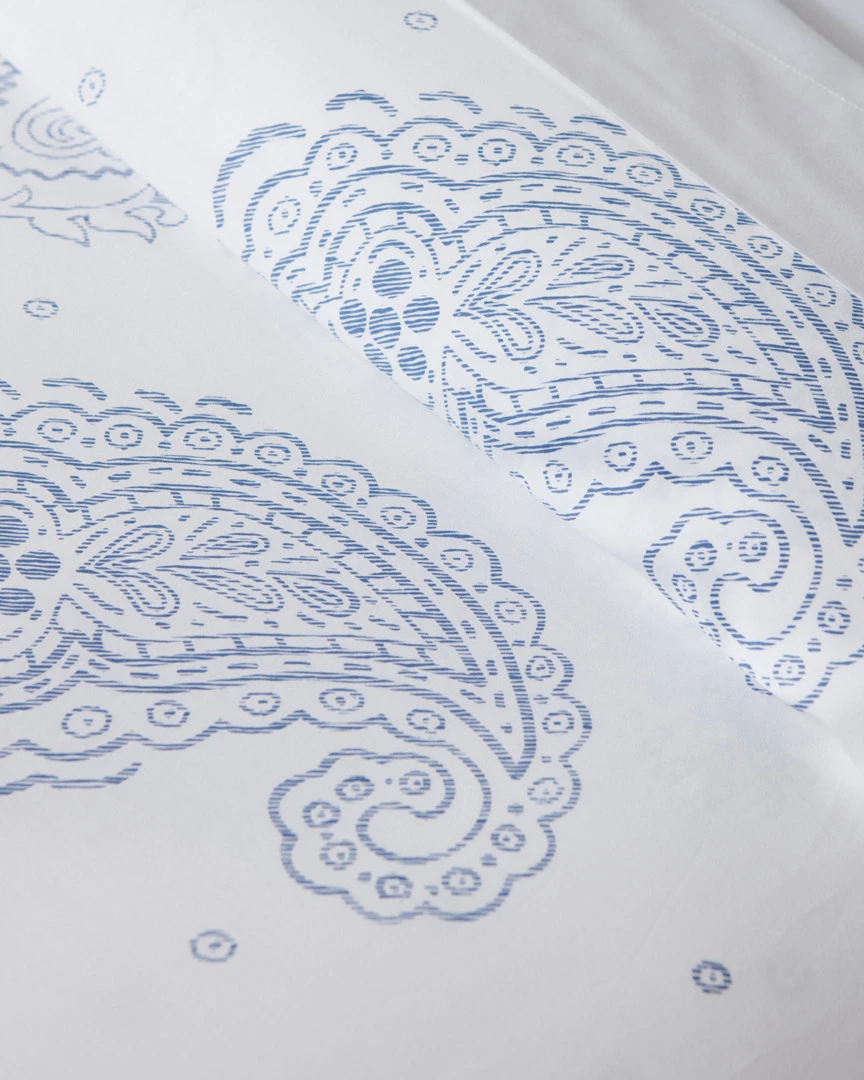 White duvet set with a blue paisley design